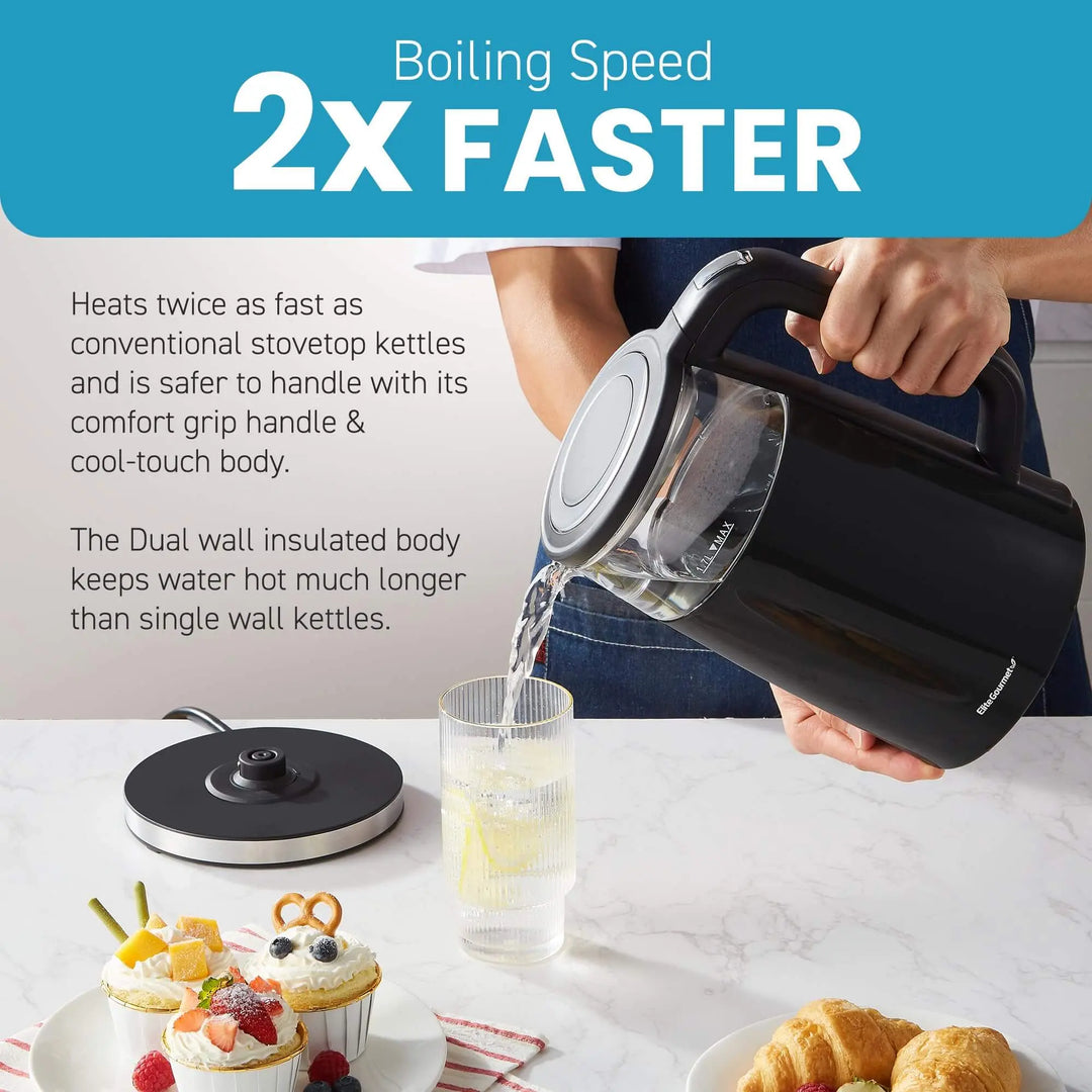 Elite Gourmet Dual Wall Cool Touch Electric Tea Kettle, 1.7 L, Borosilicate Glass, 304 Stainless Steel Interior, Programmed Digital Touchscreen, Keep Warm, Auto Off & Audible Indicator - Black
