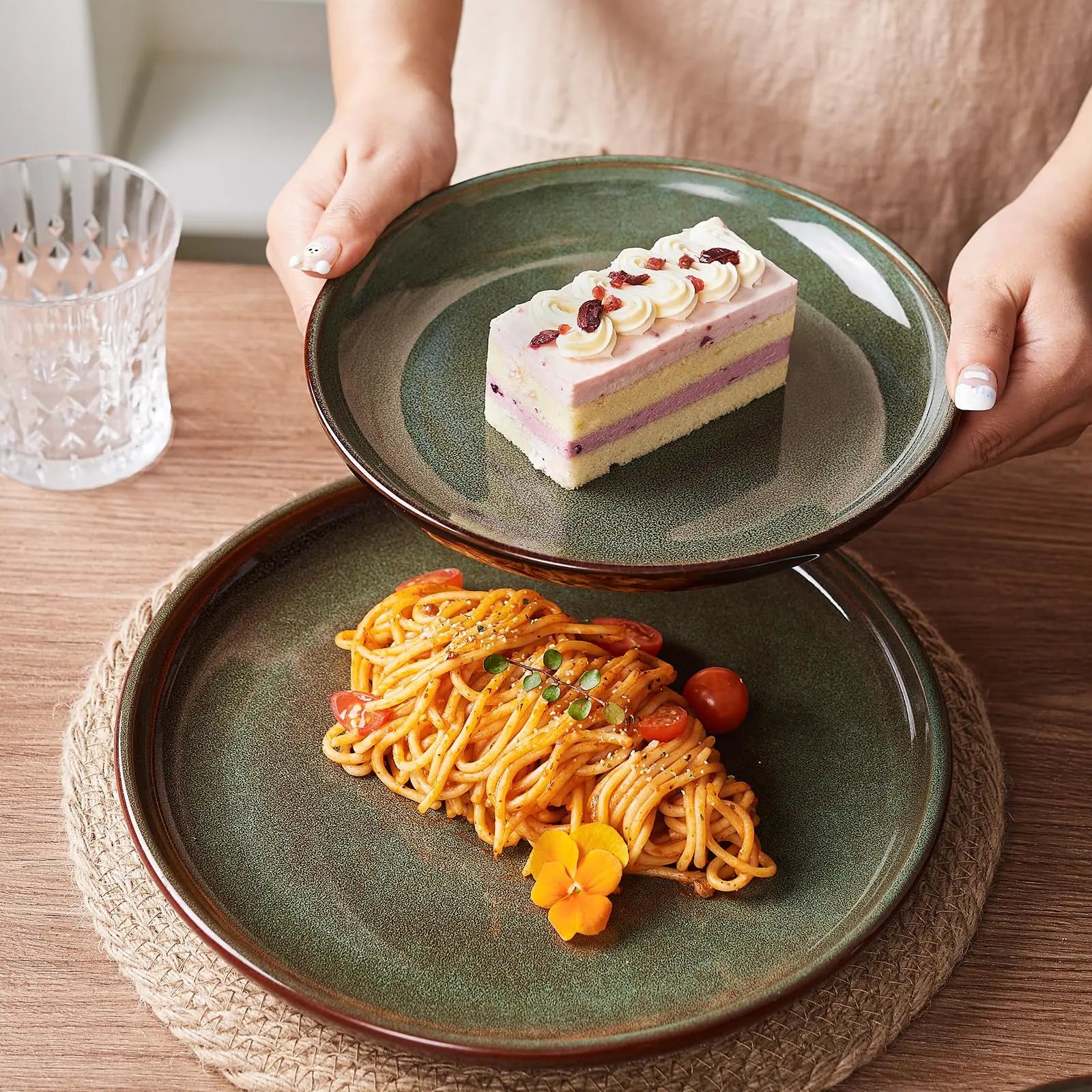 • Unique Reactive Glaze: Each piece in the set showcases a distinct, dreamlike glaze created by artisan techniques, delivering a one-of-a-kind blend of brown and green shades with subtle color gradients on the edges of bowls and plates.
