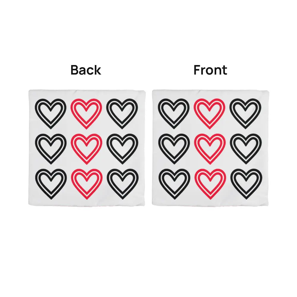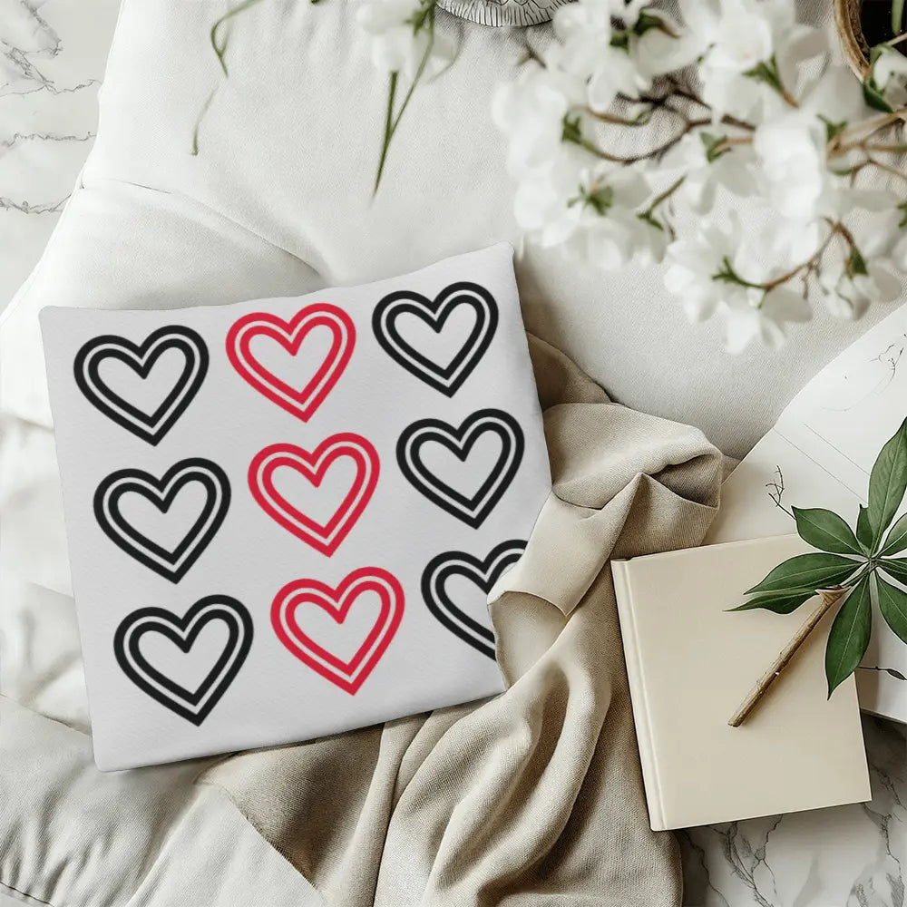 Turn heads and warm hearts with this modern throw pillow cover, showcasing a bold grid of alternating red and black hearts arranged in a three-by-three formation. The captivating pattern speaks to both romance and edge—making it a striking accent for any space that craves personality. Whether you're styling your living room, dressing up your bedroom, or gifting someone special, this pillow cover blends emotional charm with minimalist sophistication.