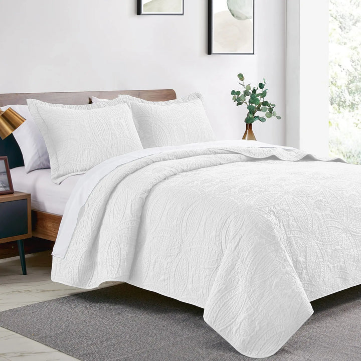 • PRODUCT FEATURES - Full/Queen size (90"x96") 3 piece quilt set comes with a quilt and two shams (20"x26"). Super soft microfiber stitched in a mutilayered technique to create a lightweight, durable quilts for year-round comforts. Solid color allows for easy matching with home decor and bedspreads.