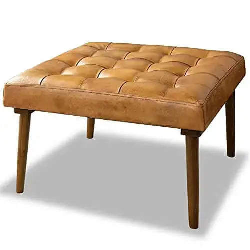 ASHCROFT Alvar Mid-Century Modern Square Ottoman, Genuine Leather - Tan ASHCROFT