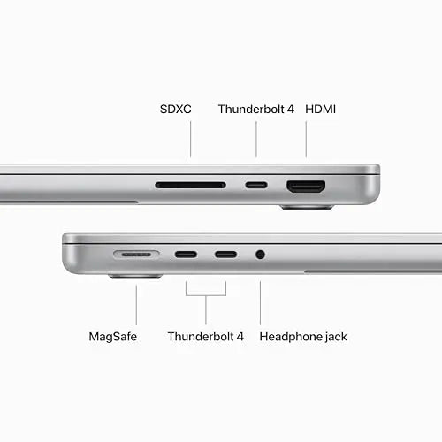 - Ports: MagSafe 3 charging port, two Thunderbolt / USB 4 ports, SDXC card slot, HDMI port, headphone jack