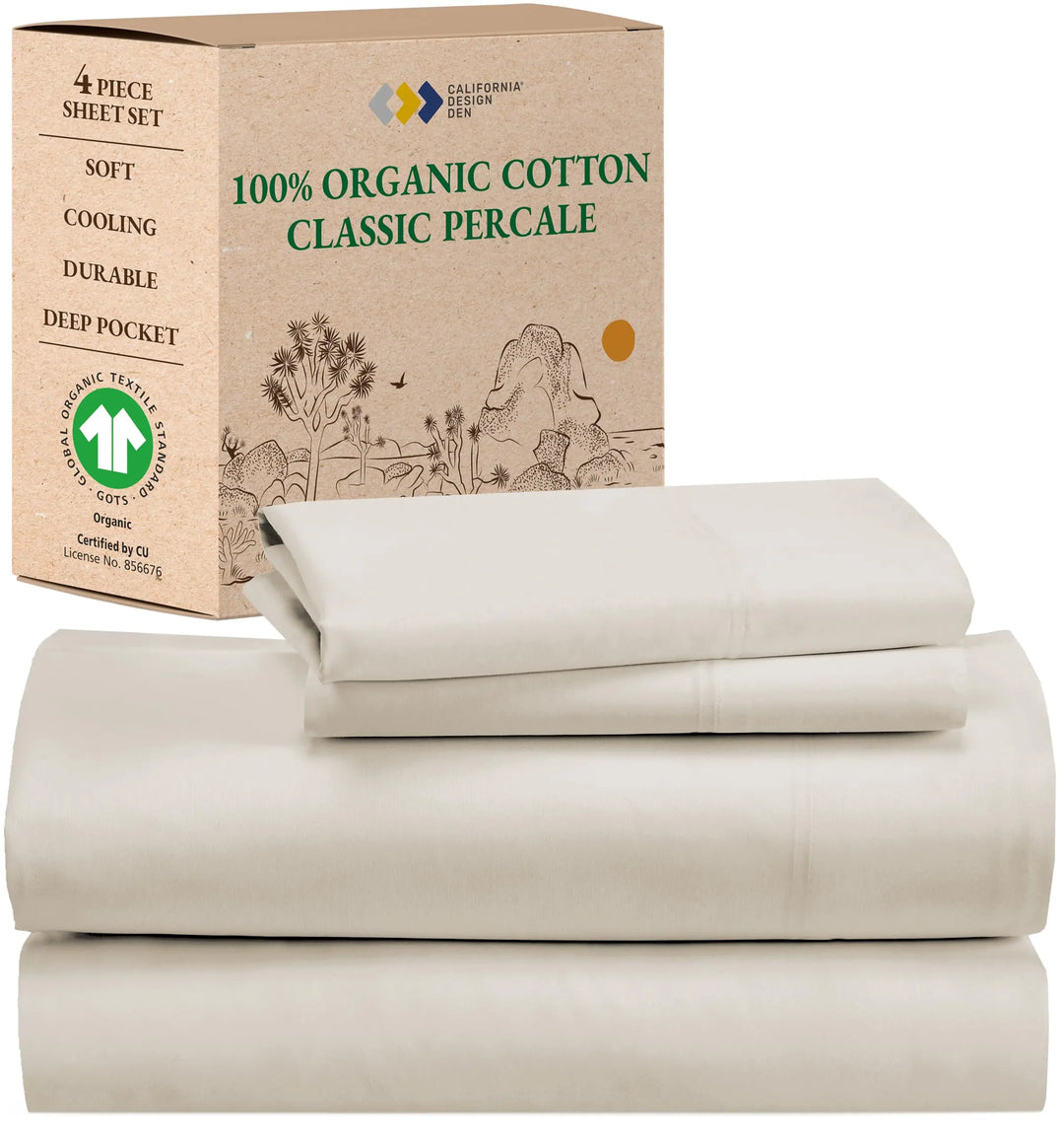 California Design Den 100% Organic Cotton Queen Sheet Set, Deep Pockets, Percale Sheets Queen, Soft Cooling Sheets, GOTS Certified 4 Piece Cotton Bed Sheets Queen, Ivory Sheets