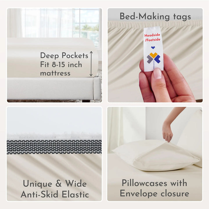 • WELL-FITTING COMPLETE SET: Our soft 4-piece cotton sheets for queen size bed set includes 1 top sheet, 1 bottom fitted sheet that fits mattresses 8 to 15 inches deep, and 2 standard / queen size pillowcases with envelope closure. The special anti-skid wide elastic won't loosen or bunch up, and head/foot side indicators make bed-making a breeze.
