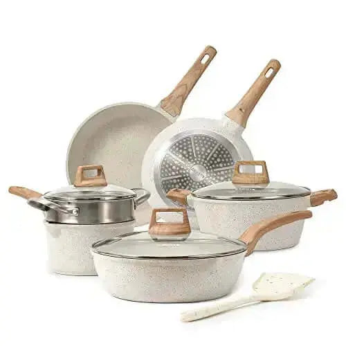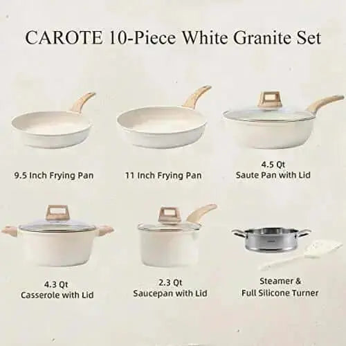 • CAROTE 10-Piece Cookware Set Includes: 9.5 inch/11 inch Frying Pan + 2.3 QT Saucepan with Lid and Steamer + 4.3QT Casserole Pot with Lid + 4.5QT Saute Pan with Lid + White Silicone Turner.