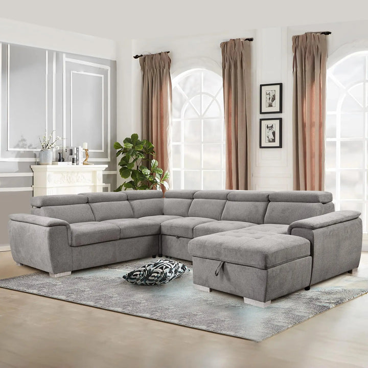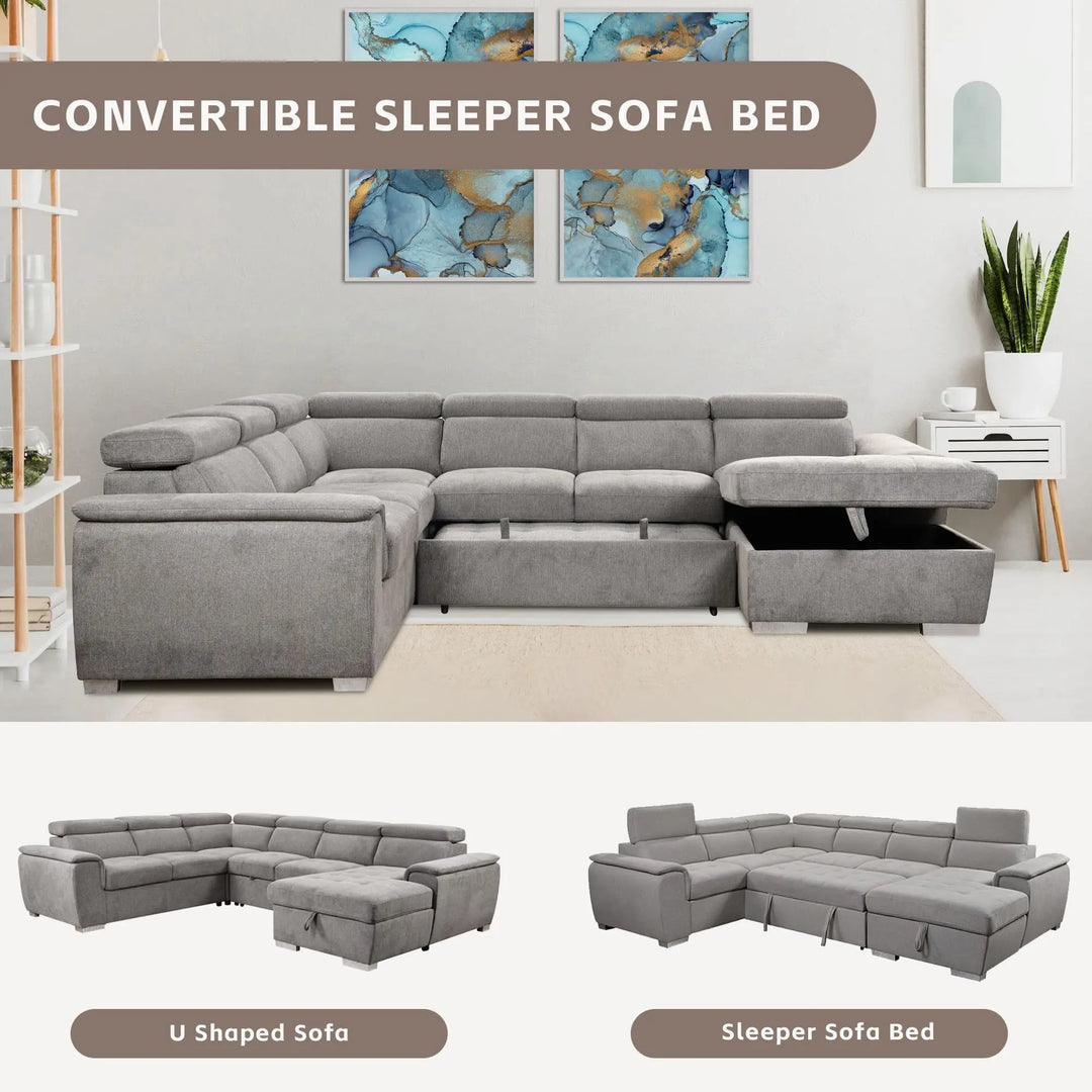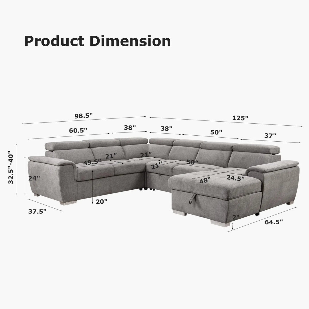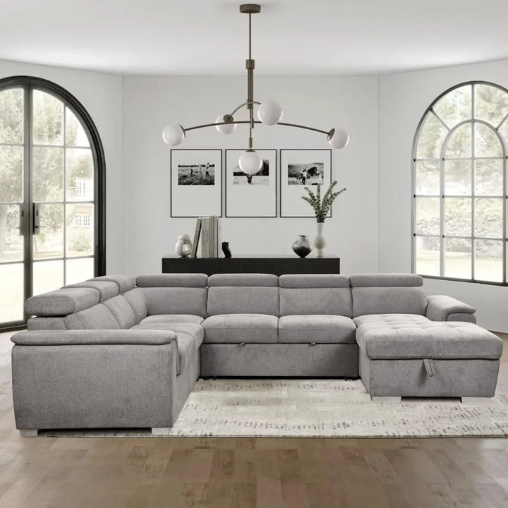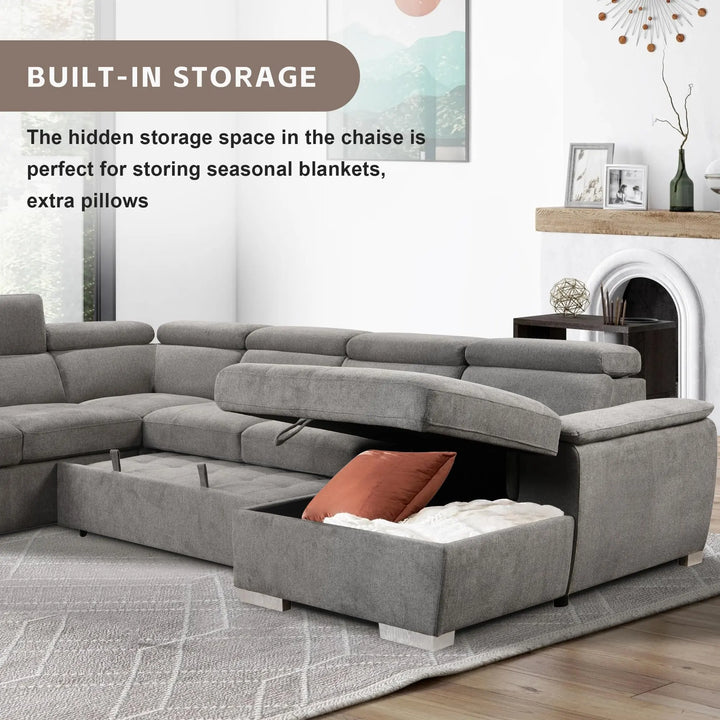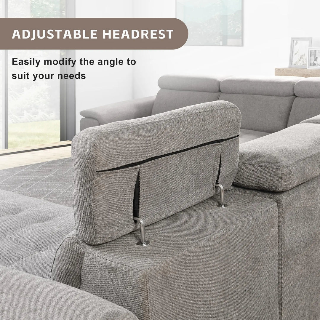 ChicFurnit Sofa U-Shaped Sectional with Adjustable Headrest, 5 Angles, 125'', Comfortable Waist Pillow & Additional Arm Cushions - Light Gray