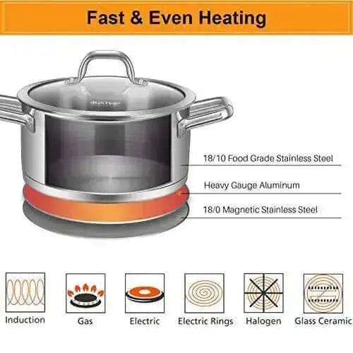 • FAST & EVEN HEATING: Heavy gauge impacted-bonded aluminum encapsulated bottom of the kitchen cookware set provides a quick, even and energy-efficient heating. Suitable for all stovetops, such as induction, gas, electric and halogen cooktops—perfect for even the most seasoned cooks.