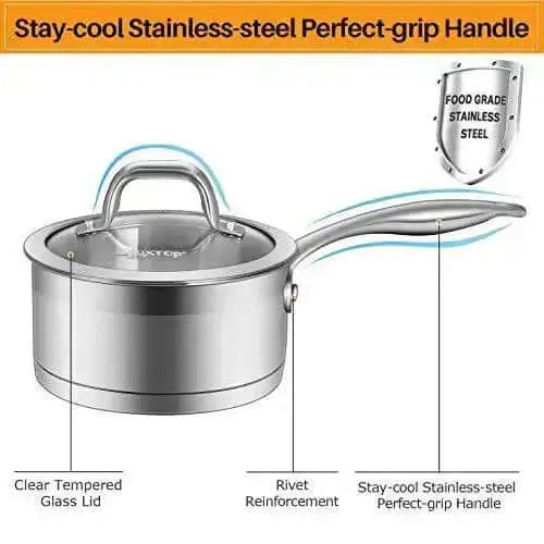 • FEATURES: Duxtop induction cookware feature a classic straight-sided and drip-free pouring design. The tight-fitting tempered glass lids allow cooking to be monitored while sealing in heat and moisture. Large riveted stay-cool stainless steel handles for easy, confident handling. Clear measure marks inside is for easy measuring.