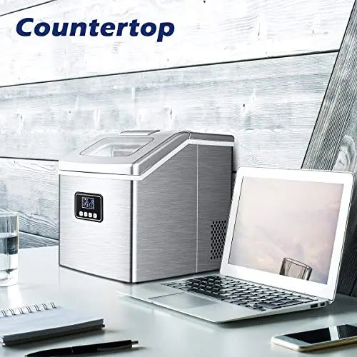 • USER-FRIENDLY - Free standing design stainless steel portable ice maker allows versatile placement. The removable ice basket stores up to 2.2 lbs. of ice at a time, ensuring that you have ice ready whenever you need it, and it comes with an ice scoop to facilitate ice removal. It’s easy to clean, use, control and transport. For best results, keep tabletop ice maker machine upright for at least 24 hours before first using it.