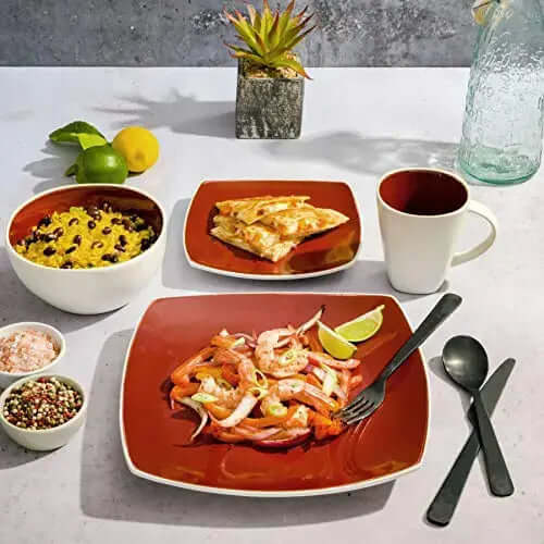 Add a stylish, contemporary look to your table with the Gibson Soho Lounge Square 16-piece dinnerware set. A contemporary square shape and a stunning color design elevate any occasion and create a beautiful platform to show off your delicious meals.