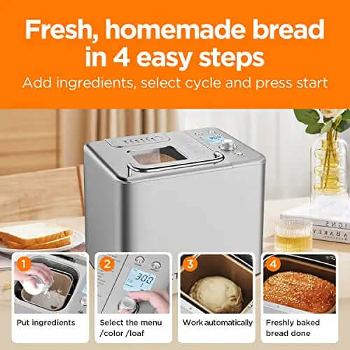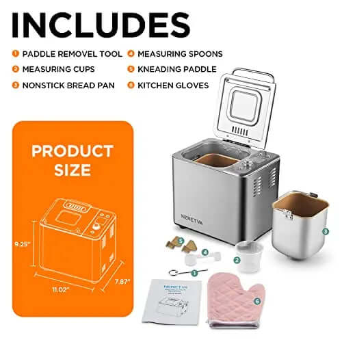 • Features: Automatically mixes, kneads ingredients with kneading paddle, Digital LCD display for easier programming, 15H Timer, crust, loaf size. Large viewing window offers you a full view of the process,  AC motor for less noise, 20 Mins Power Interruption Recovery, 360° double tubes heating promotes heat circulation allows enjoy the freshier and healthier homemade bread anytime.