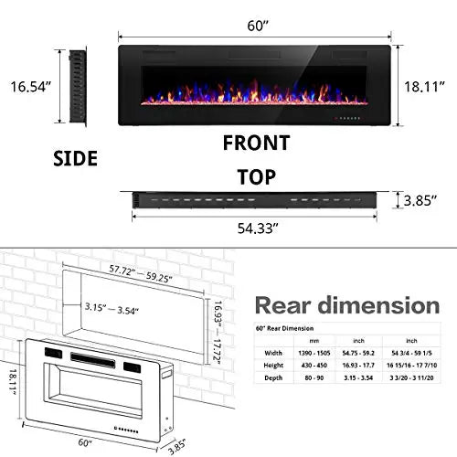 • Attractive and Practical Design: 60"L x 18.11"H x 3.89 "W. The thickness of the new style is only 3.85 inch, while the older model is 6 inch. It operates the same as the older model. The location of the main power and power cable have been redesigned, which makes the new fireplace more attractive and practical.