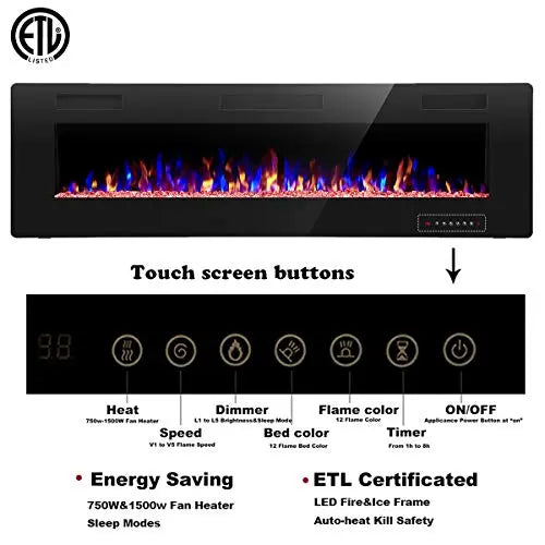• Multi Operation Modes: Touch screen and remote control; 12 flame & LED flame bed color modes;5 flame speed modes;5 flame brightness levels; Specially automatic flame design(the flame color and brightness changed