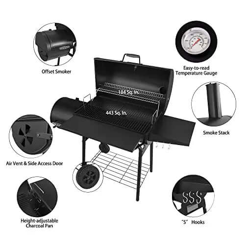• Tasty Smoke Flavors: The offset smoker is firmly attached to grill to ensure good circulation of heat and smoke. Easy to open side door to add charcoal and remove ashes; air vent stokes fire instantly.