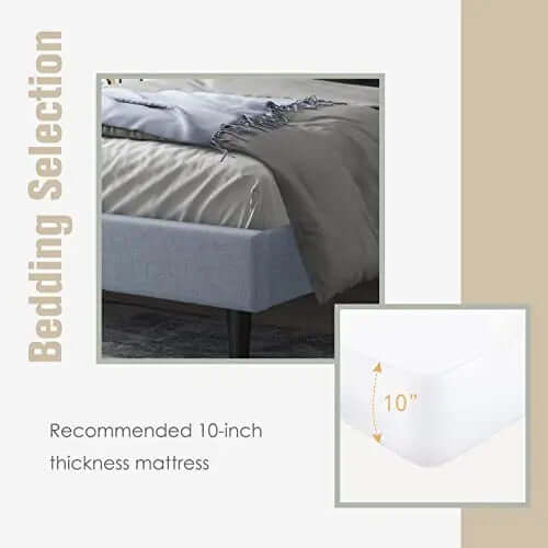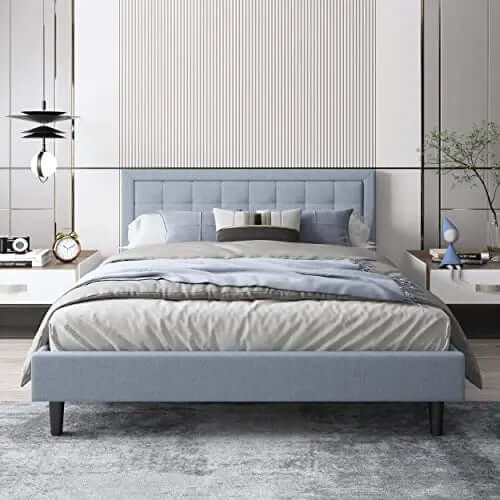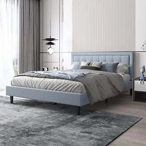 Upholstered Linen Platform Bed Frame, Wood Slat Support - Light Grey
